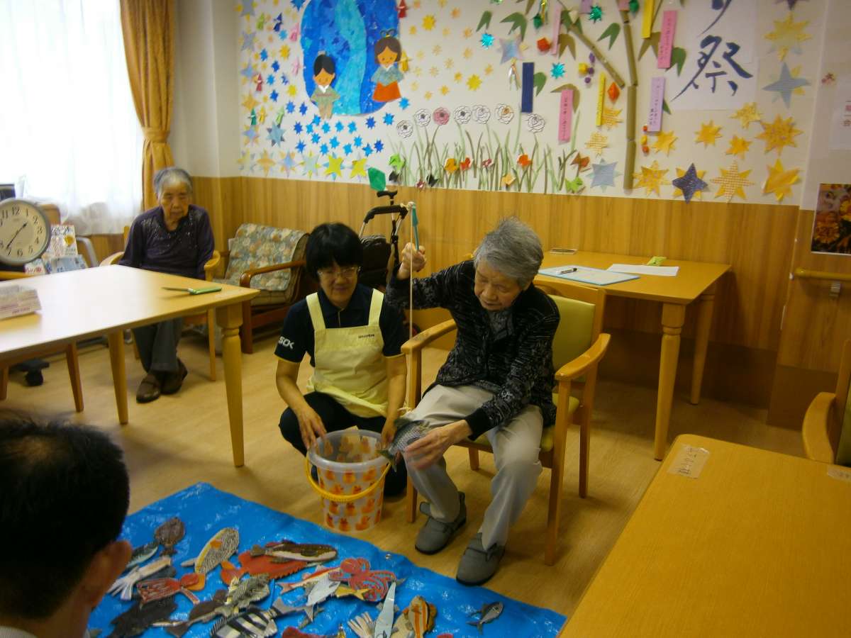 ゲームは接戦で、わずか1匹の差で織姫チームの勝ち。個人成績では、制限時間内に20匹を釣り上げた女性入居者様がトップ。「たくさん釣れたで賞」を受賞されました。