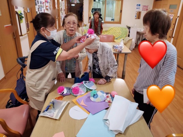 作った笠を実際にかぶってみたりと盆踊りが待ちきれない様子。