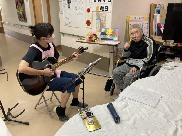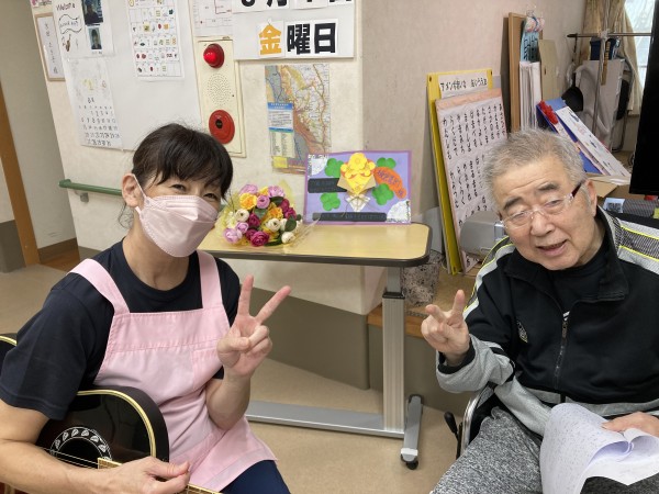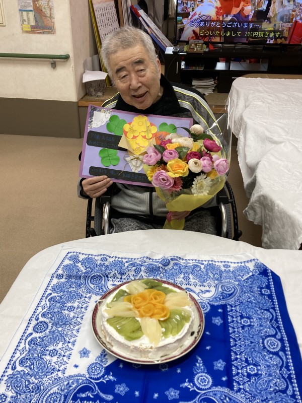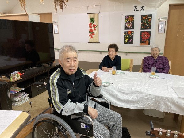 今回は何と!職員の手作りによる超ふわふわのスポンジと、デコレーションまで全て手作りです(#^.^#)(≧▽≦)そして、ノンアルコールビールで乾杯????のあと、職員がギターの弾き語りです???? お祝いの「ハッピーバースデー」を皆さんで合唱の後、昭和の歌謡曲で盛り上がりました!!????????(^^♪ いつも優しい笑顔を見せてくれて、ありりがとうございます????これからも、笑顔を見せて下さい(*^^)vまた来年も乾杯????しましょう((´∀`))