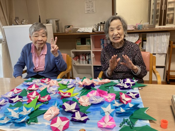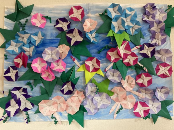 水色一面の用紙に利用者様とスタッフとで沢山作った「アサガオ」を一つずつ丁寧に張り付けてくださいました。