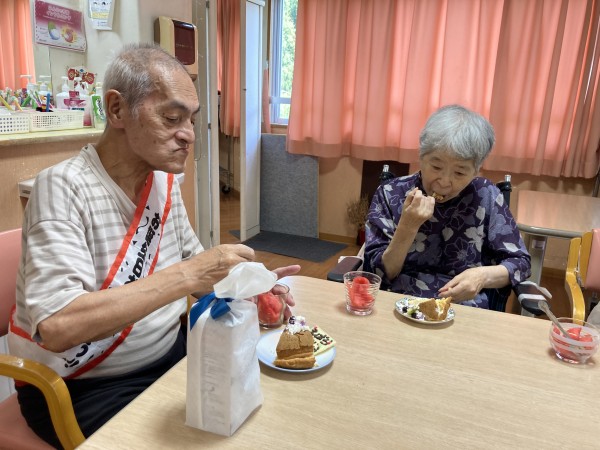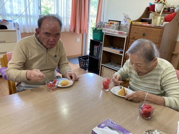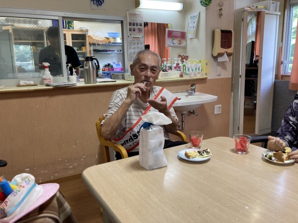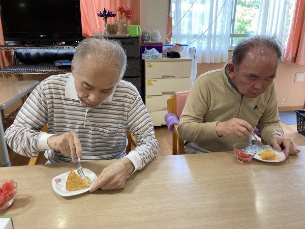ケーキと一緒に食べているスイカはホームで採れたものです。今回はスイカも2種類植えておりもう片方のスイカも美味しくできてることを願うばかりです。