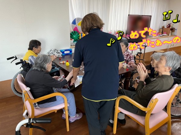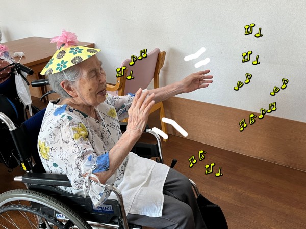 花笠でお祭り気分になった入居者様が、歌い出します♪