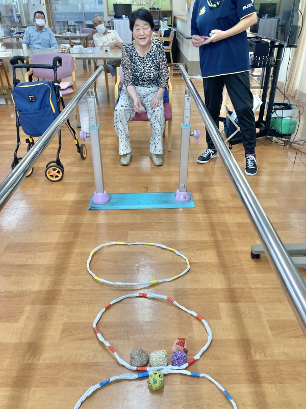 平行棒を歩いて、席へ戻って頂いています。