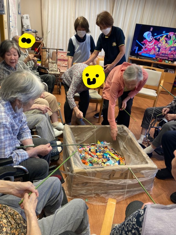 折り紙の金魚と、駄菓子を釣り上げるゲームです。