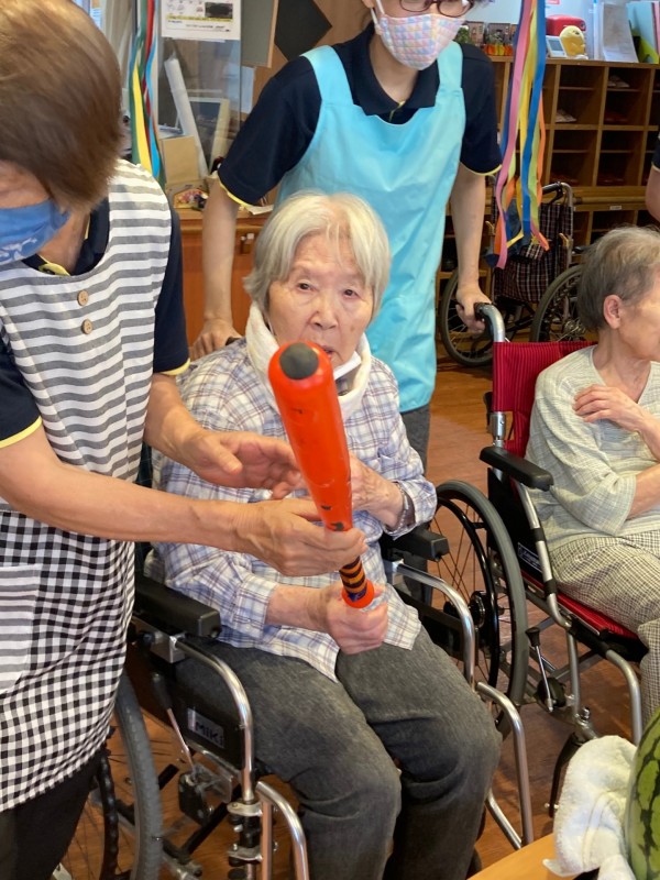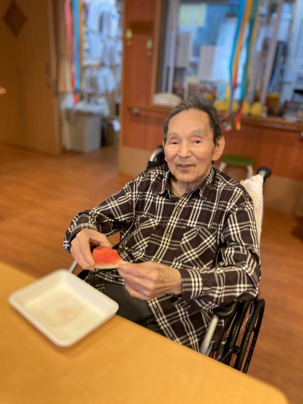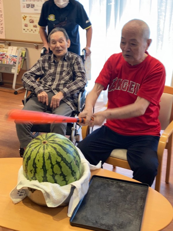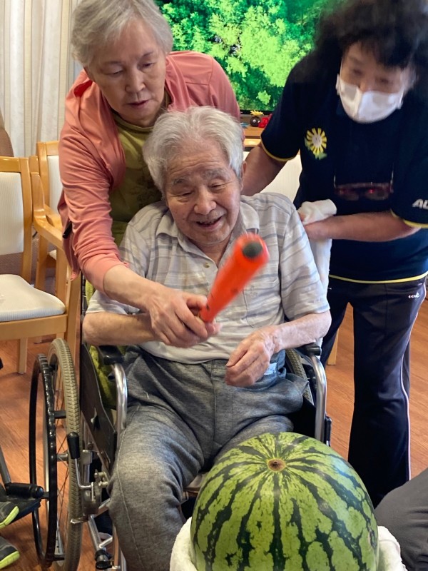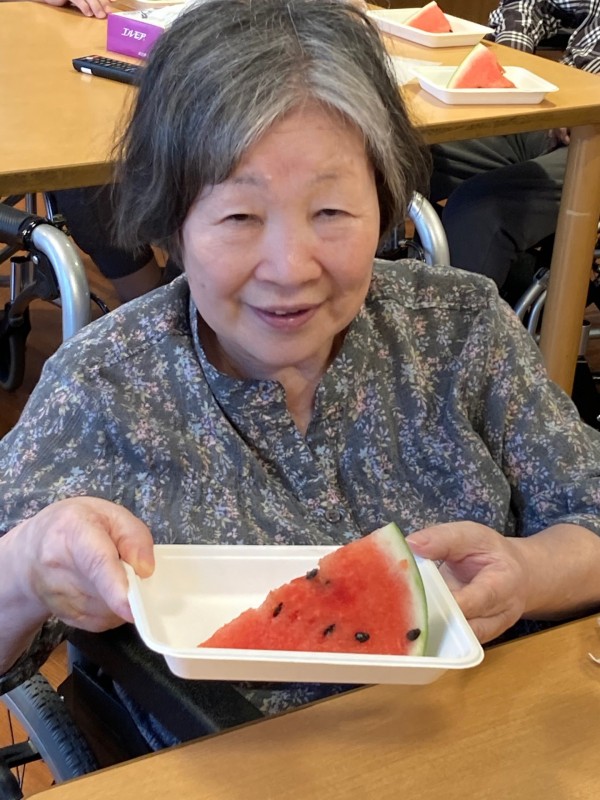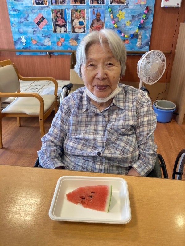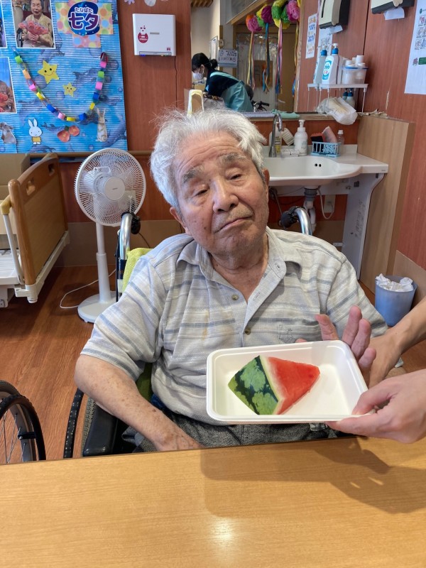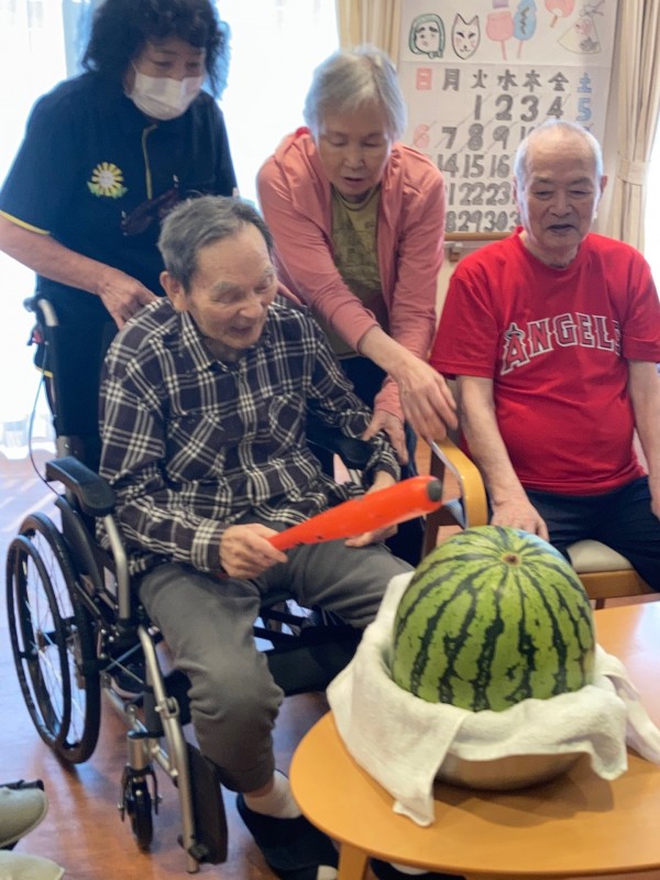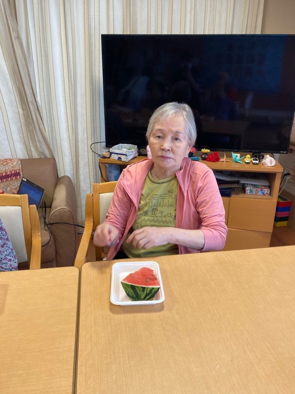 待ちきれないので、職員が、木っ端微塵にスイカを華麗にカットしました(^^♪ おやつはスイカです