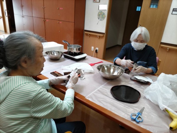 湯せんは職員でやり、本日のメイン!バナナにチョコ塗です。