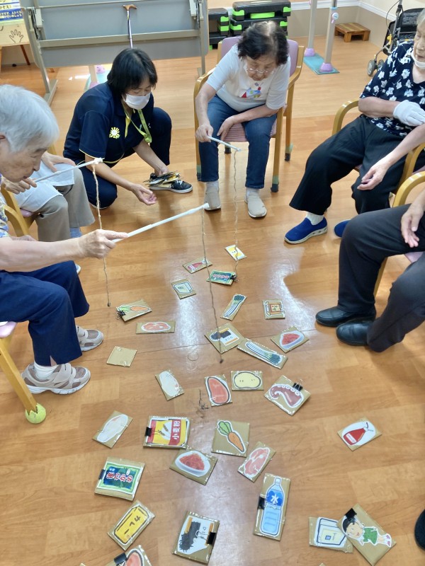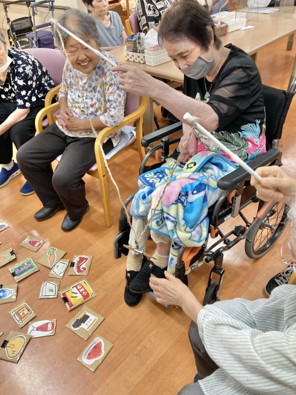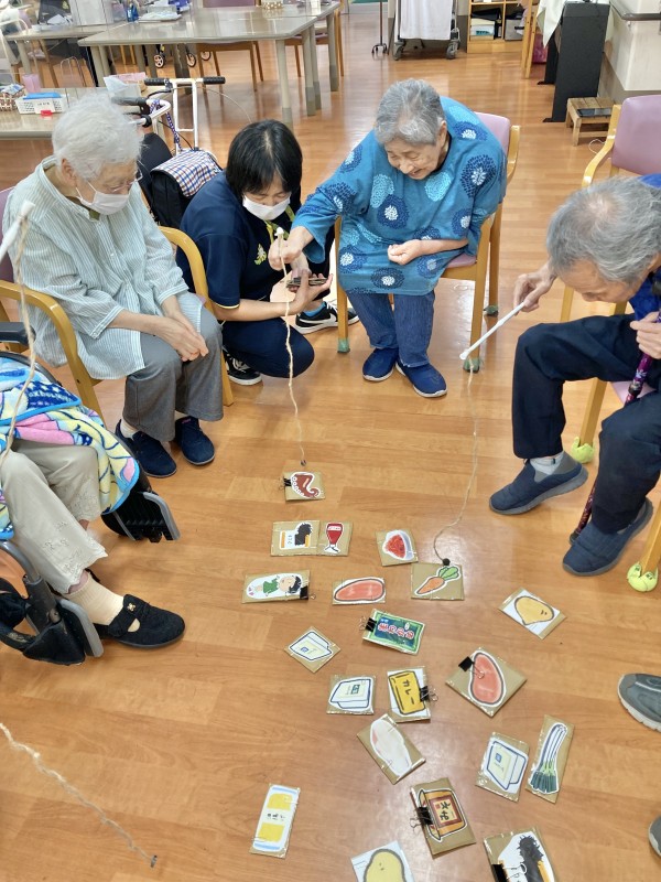 以前は、平行棒の周りに食材を置いていたレクです。平行棒の周りを囲むのが難しくなった為に魚釣りのように行っています。