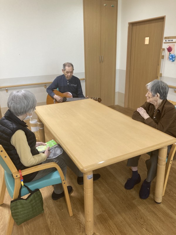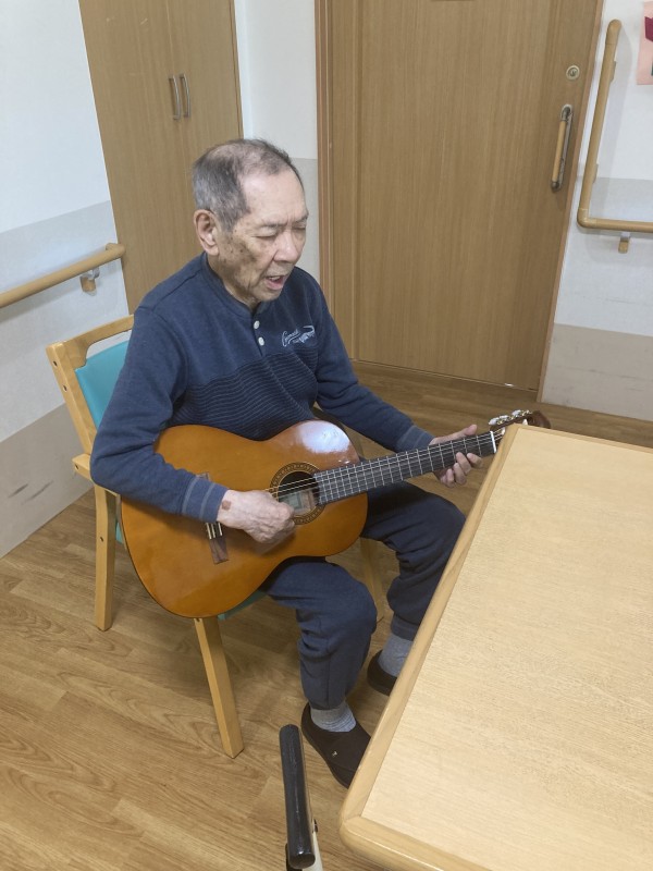 こんにちは! グループホームみんなの家・川崎新百合ヶ丘の介護ブログです。今回はご利用者様の普段のレクリエーションのご様子を紹介させていただきます!今回はご利用者様がお茶の時間の後に、空いた時間でギター演奏をされていました。