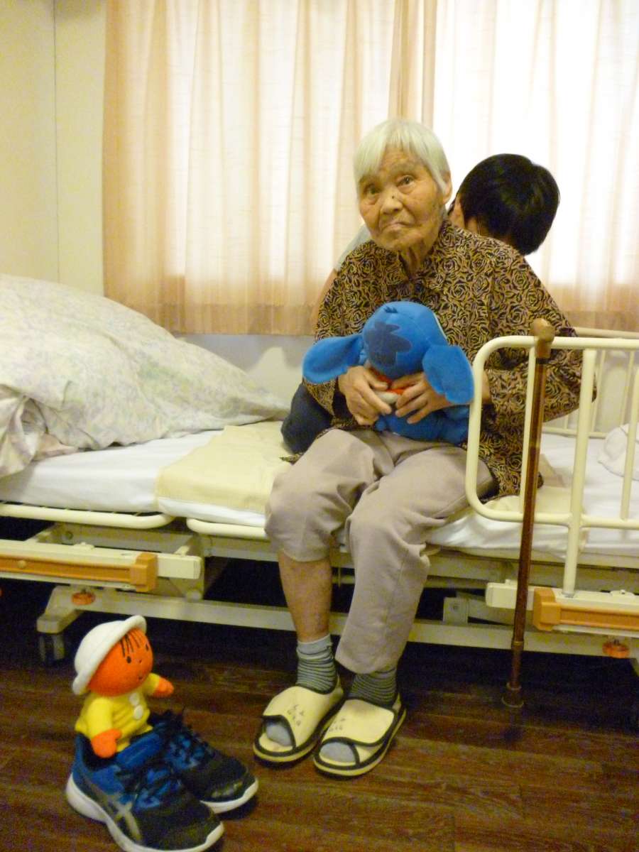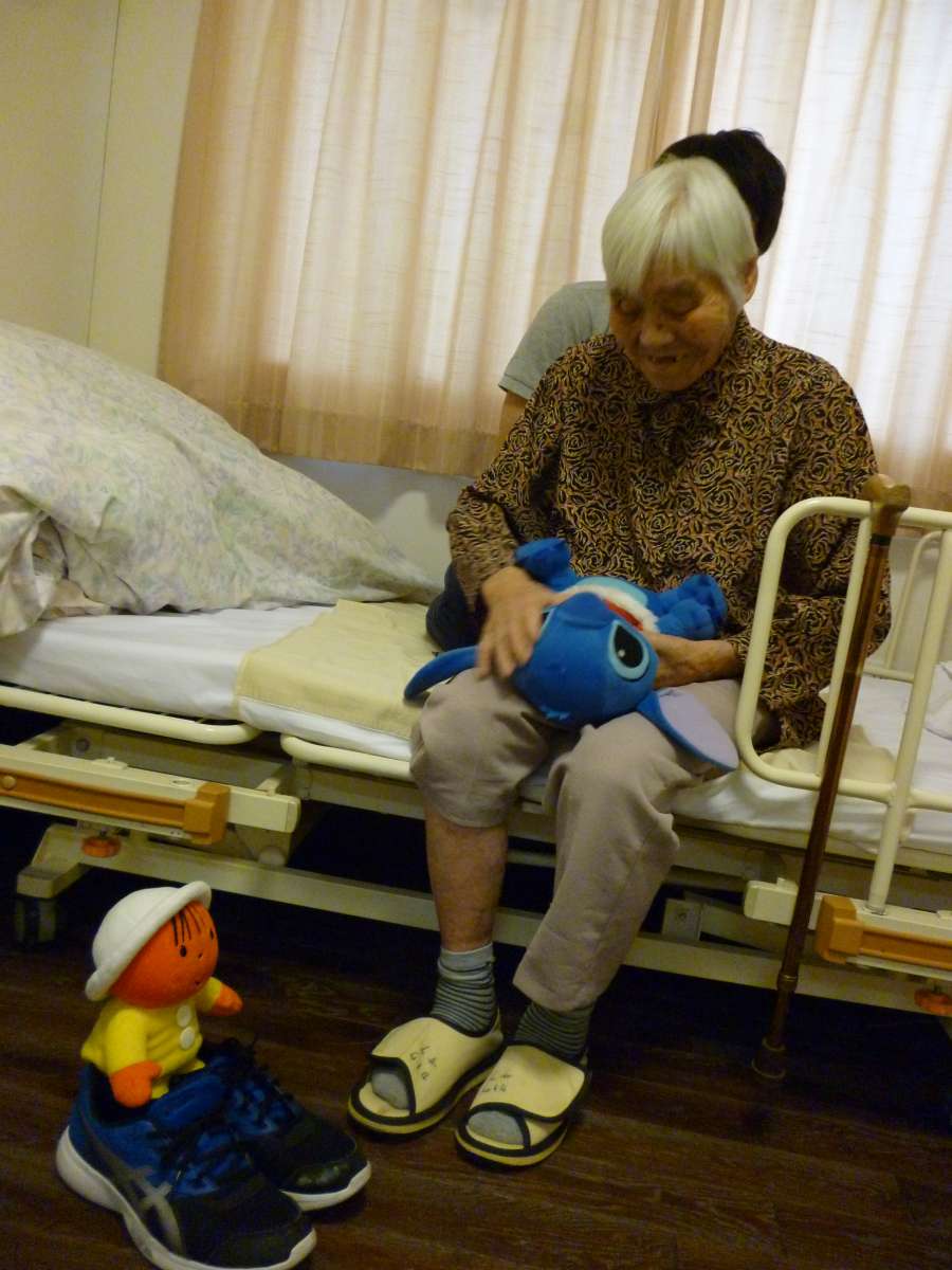 ベッドで塗り絵の神、K様が人形を携え腰のマッサージを受けております。