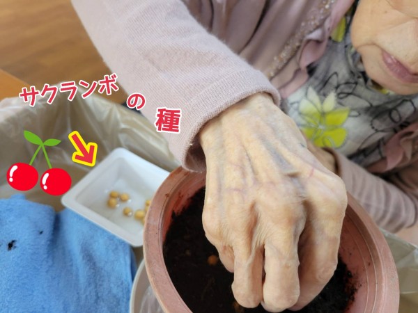 ひとつひとつ、丁寧に気持ちを込めて土に蒔く奥様。