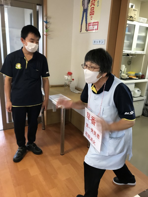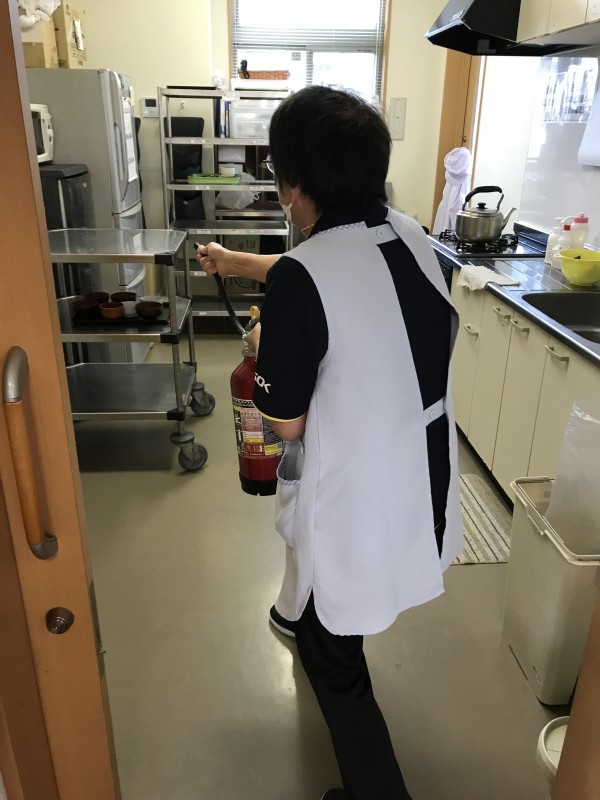先日、ホームでは消防訓練を行いました。今回は【2階厨房からの出火】という想定でした。