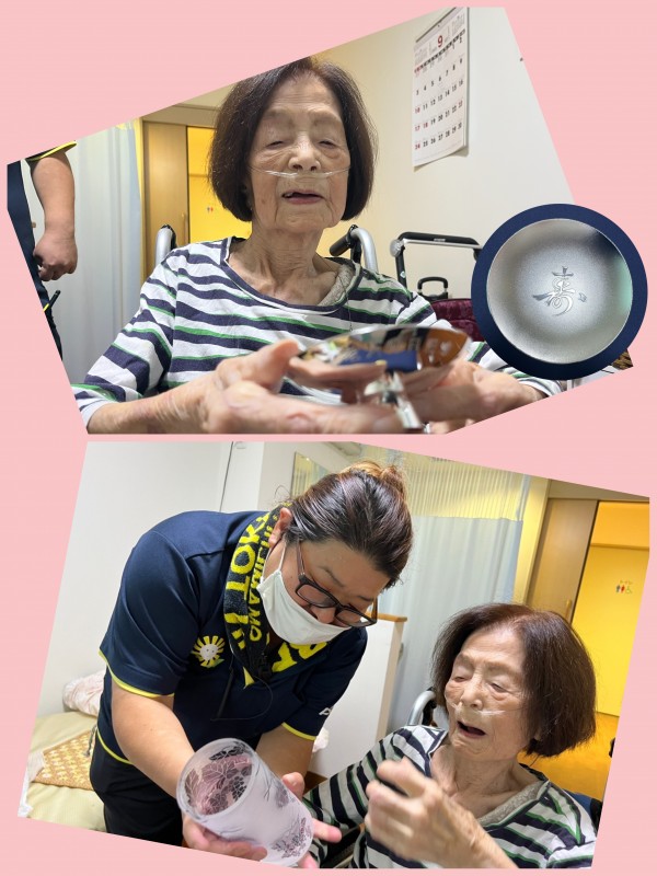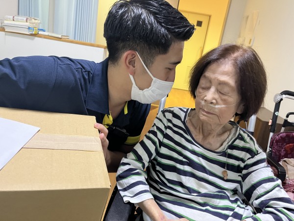 ご長寿様のお部屋に、荷物を抱えてやって来ました。