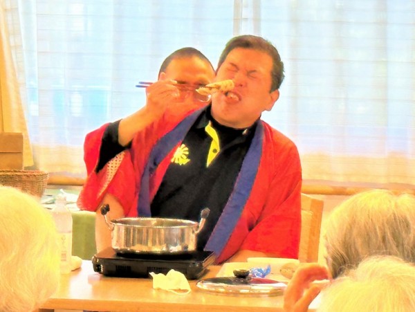 介護の現場で日々鍛えられているチームワークを魅せる絶好の機会になる筈でしたが、アツアツのおでんは無情にも職員の顔面に(笑)