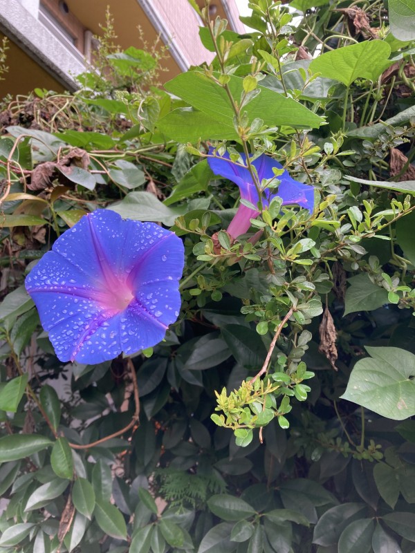 そしてお昼近くになると、空には青空が顔を出し…雨に濡れた西洋アサガオが素敵な演出をしてくれています!