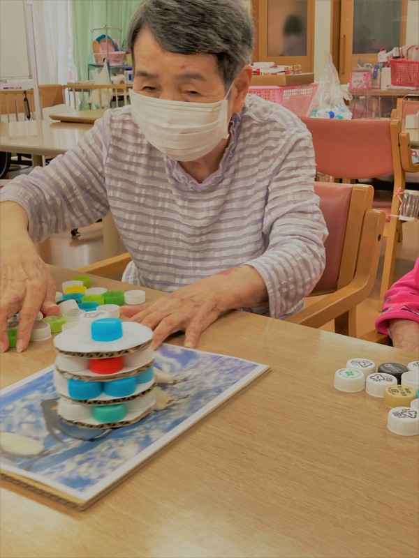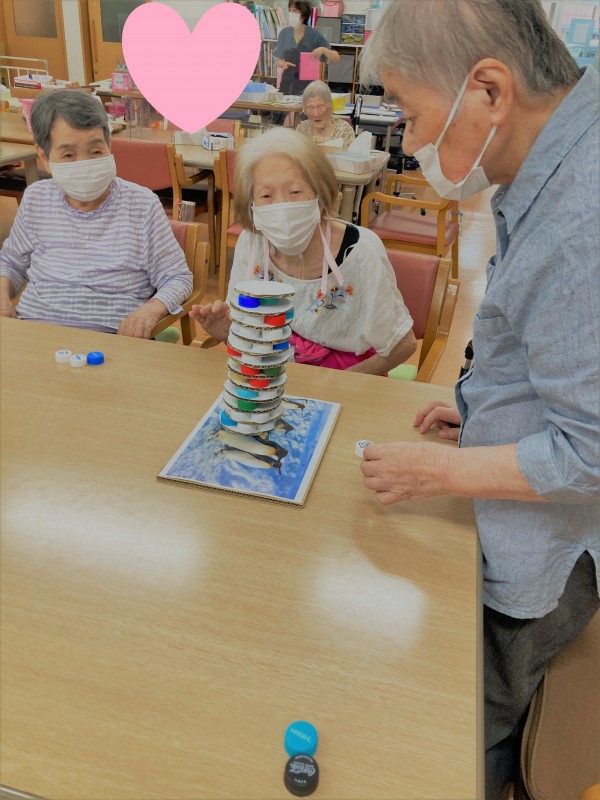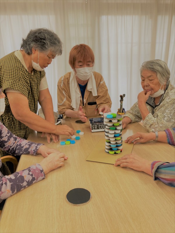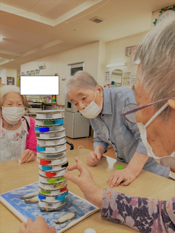 そのあとはなーんと!いつものバランスゲームのごとくキャップをとっていきます!少し小さめのジェンガですね