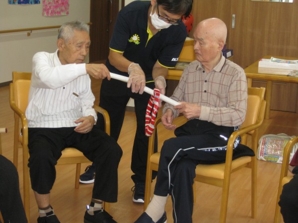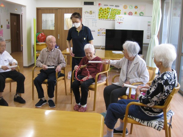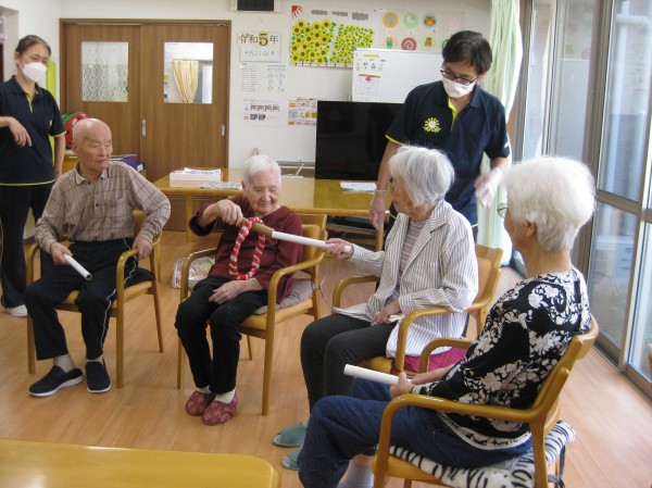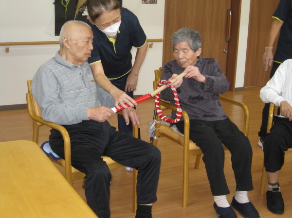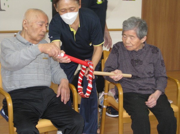 ペアになって棒と棒を合わせて輪を繋げていく遊びです。難しかったが慣れてくるとすぐに繋げていくことができました(*^_^*)