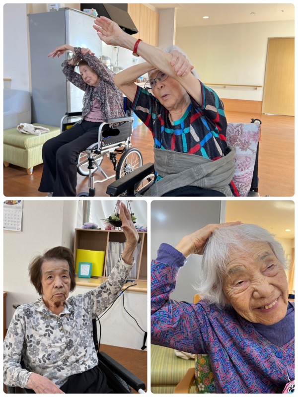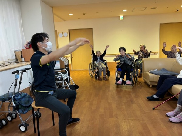 職員さんが先導し、ご入居者様が楽しみながら体を動かしています。