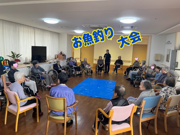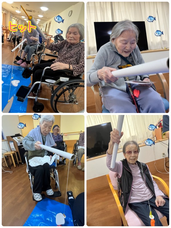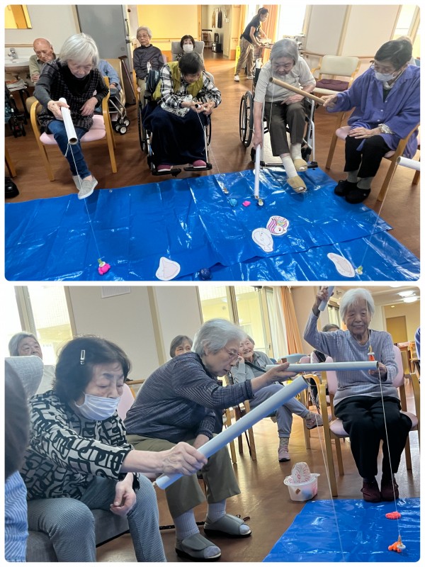 ご入居者様達が釣り糸を垂らし、魚がかかるのを待つ。。。