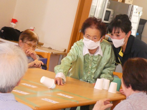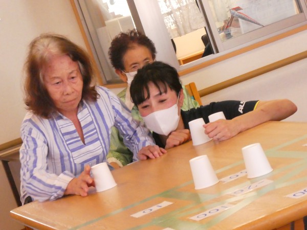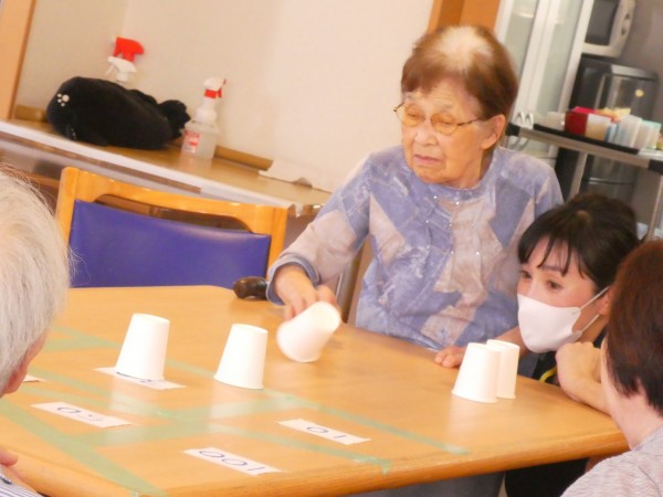 紙コップを使っての“テーブルホッケー”です♪中にゴルフボールを入れて動く様にしていますっ