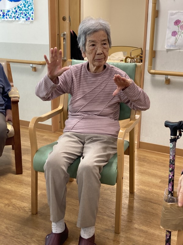 ややアップテンポの曲に変わりリズムに合わせて手を上げたり、先生とハイタッチしたりと楽しまれ最後に深呼吸をし無事に終了いたしました。