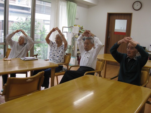 手を上げて手を下げて・・・ みなさましっかりと身体を動かされています。リズムに合わせて楽しまれ運動されています(*^。^*)