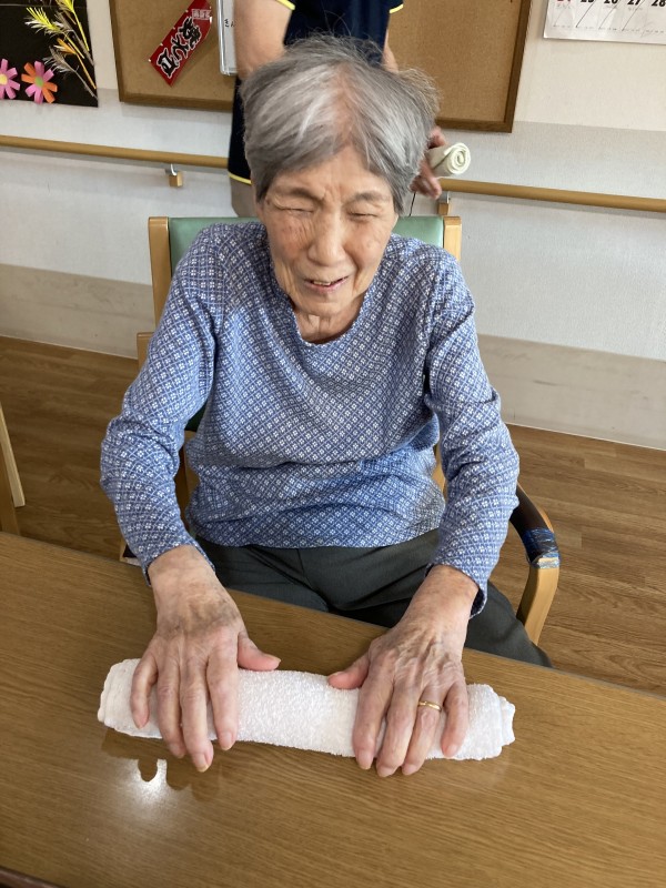 タオルをせっせと巻いては棒のようにして、広げてはまた畳んだり