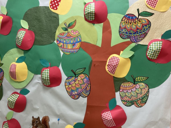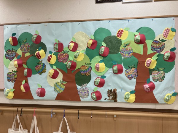 1つ目は、画用紙をリンゴの形に切ってチェック柄やドットの用紙を貼り合わせてできています。