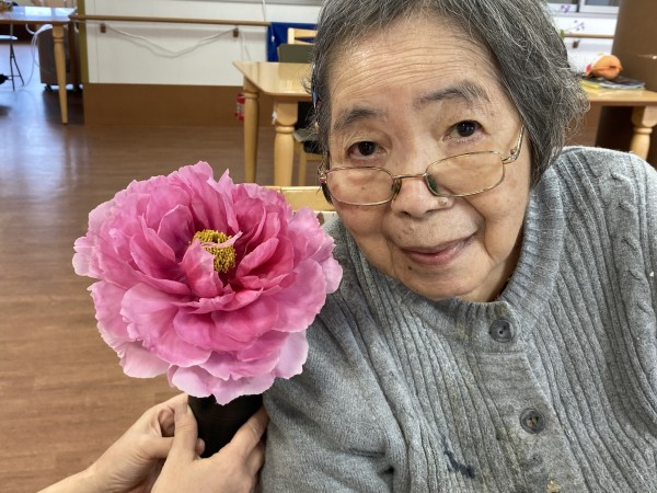 「お花持ってきたよ!描く?」と聞くと「あら、綺麗ね」とニコニコしてやる気満々!