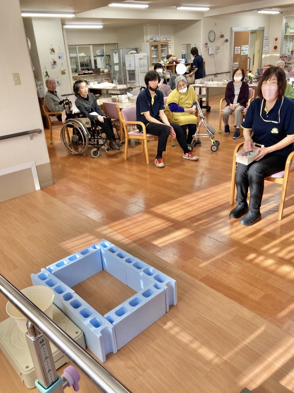 青色の枠の中、青色発砲スチロールの小さな穴、奥の入れ物にそれぞれ得点をつけています。