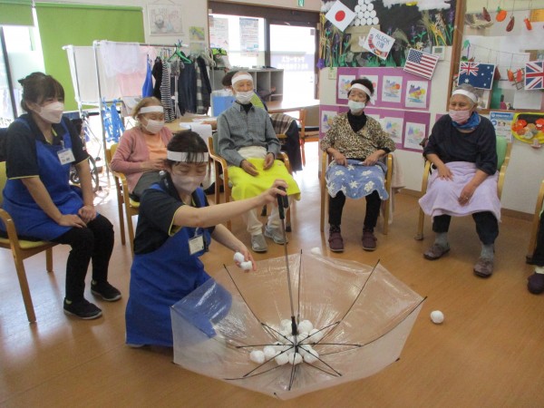 2種目目は「玉入れ」 1回目は傘に向かって投げます。 2回目はカゴに変えてみました。どちらが沢山入るでしょうか?