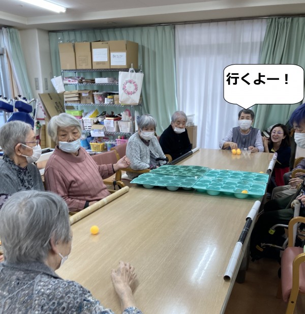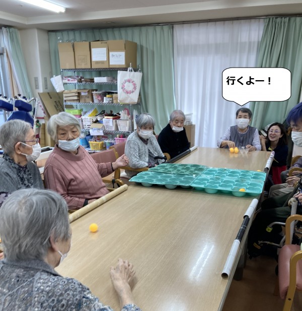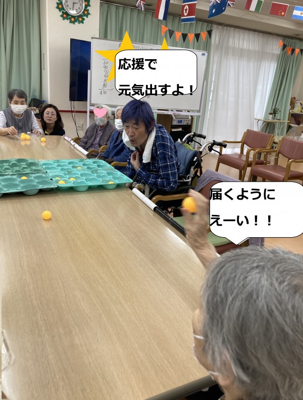 そんな今回のレクリエーションですが、14日(土曜)に行いました「ピンポン玉入れ」の模様をお送りしたいと思います♪