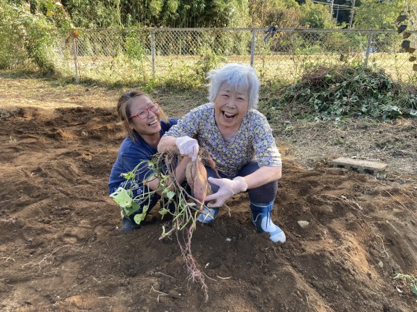 10月オレンジカフェの本命である。さつま芋ほりの様子をお伝えしていきたいと思います。前回でもお伝えした通りこの日は風が強く外に長く滞在するのが入居者様によっては大変と思い。数名の入居者様しか実際に芋ほりをすることが出来ませんでしたが、家族様と一緒に写真を撮ったりとそれぞれ楽しまれました。