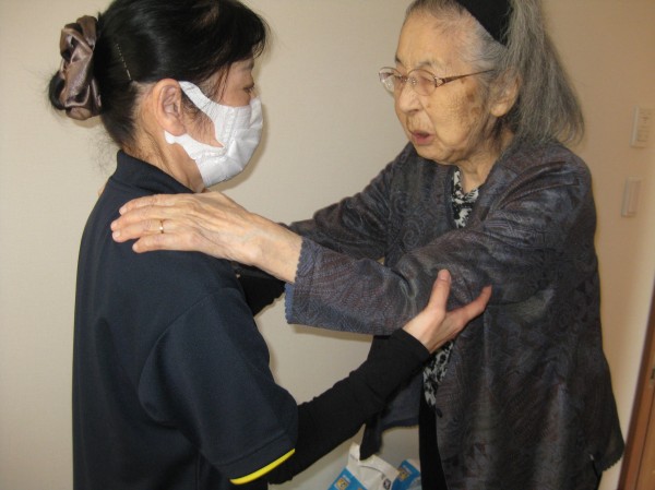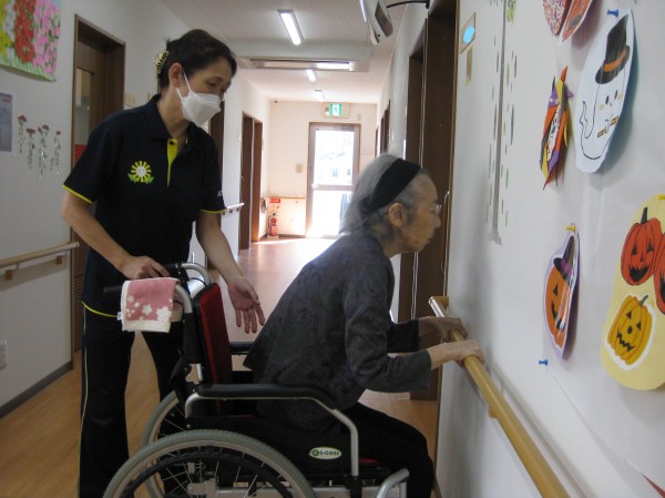 立てるわよ!歩けるわよ!と話されています(*^。^*) 立つことから始めました。つかまって歩かれているご様子です!!