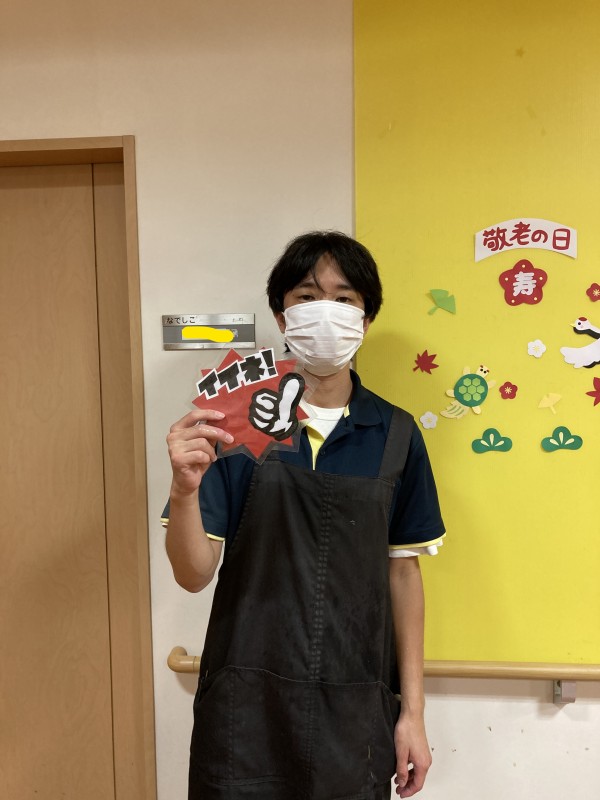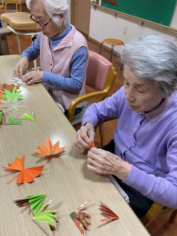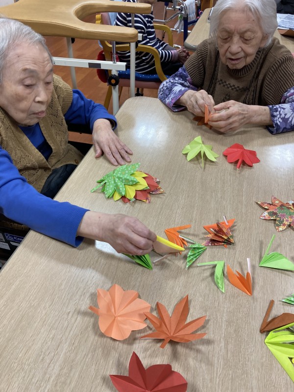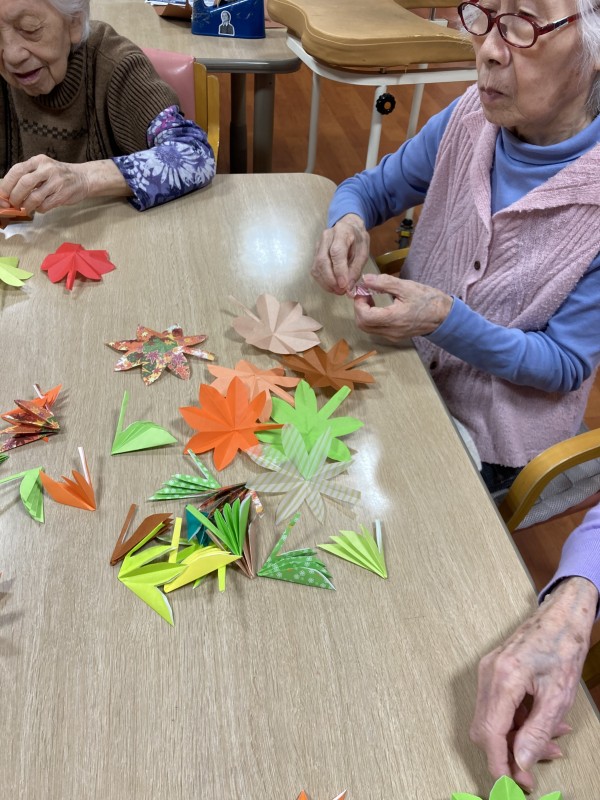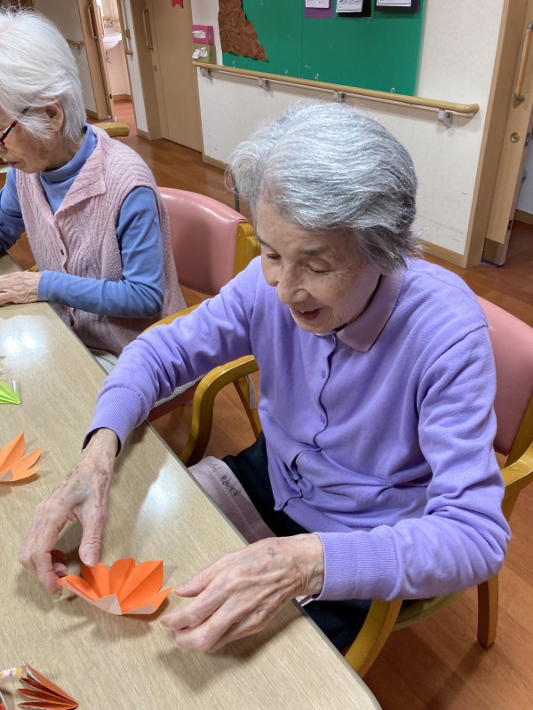 職員と一緒に折り紙をおり、皆さんに広げてもらい、