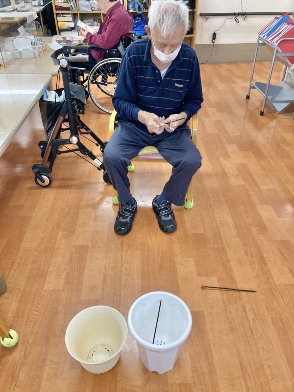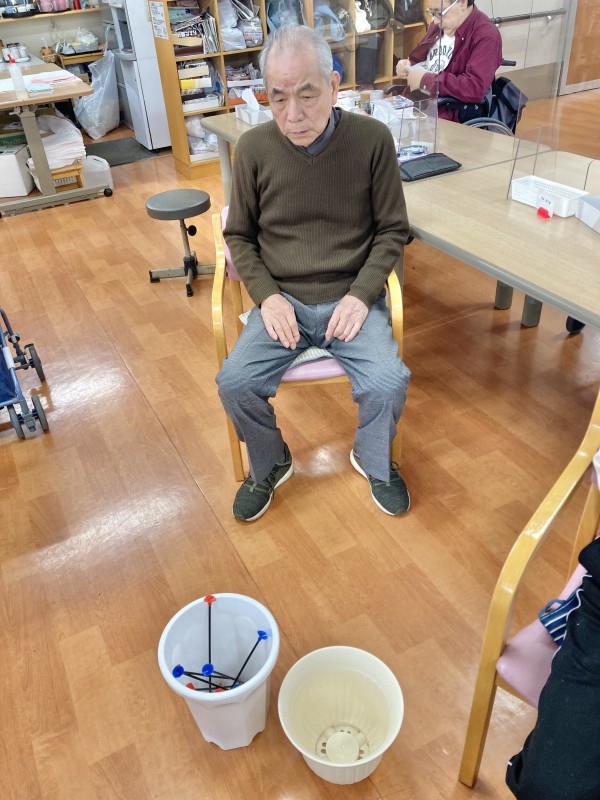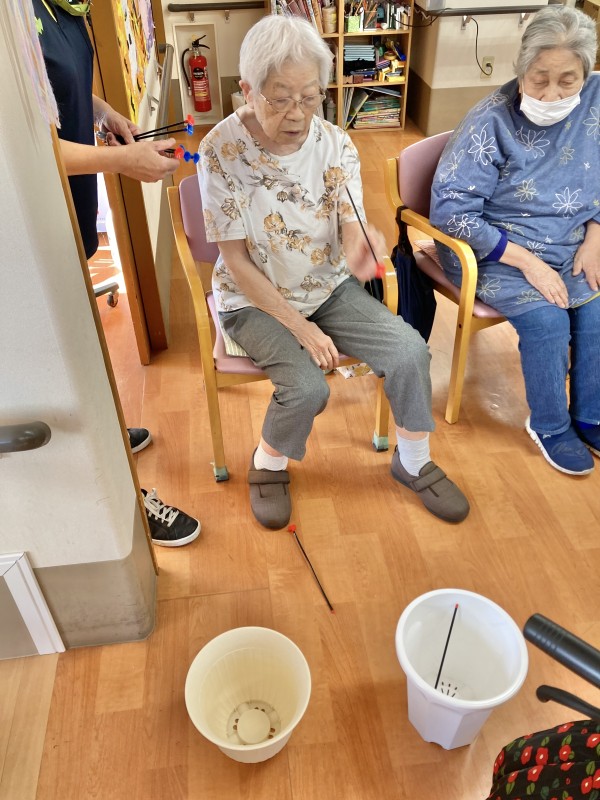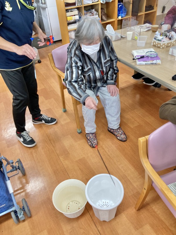 1人9本の矢を、壺に見立てた入れ物に投げていくゲームになります。