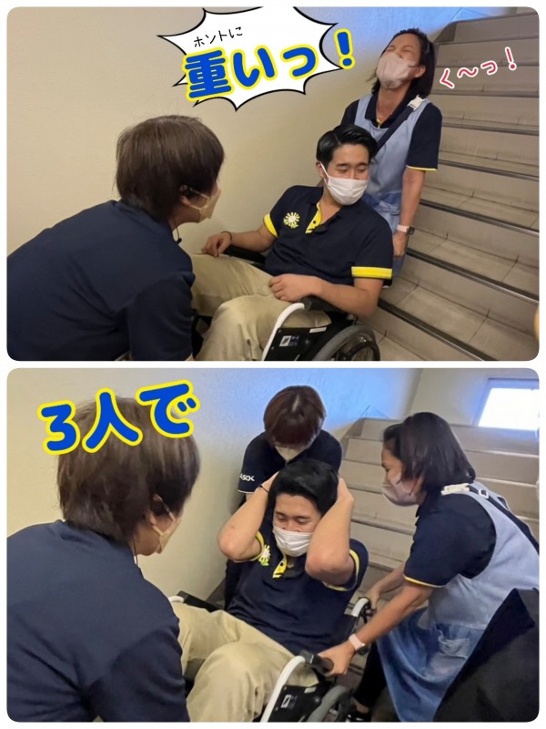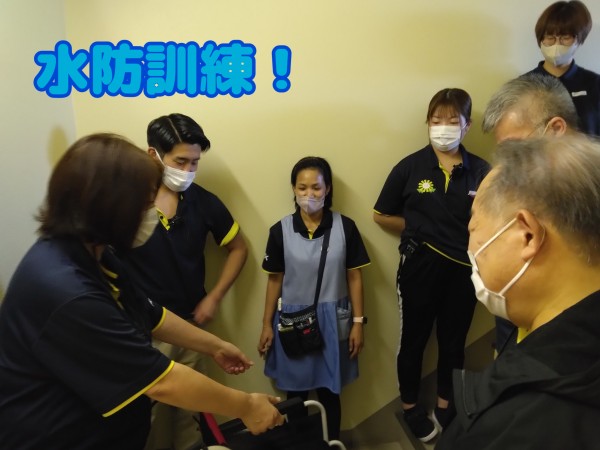 今回は、車椅子の階段避難訓練をしましたが、夜間やスタッフが少ない時、まだエレベーターが止まる前に早めの情報収集と判断をしていく事など、臨機応変に対応できるよう、日頃の訓練が大切です。