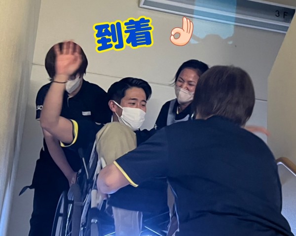 浸水から逃れるために、下の階のご利用者様を車椅子で階段を上がる想定です。