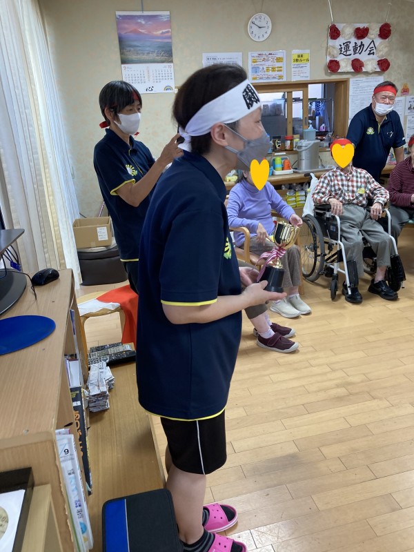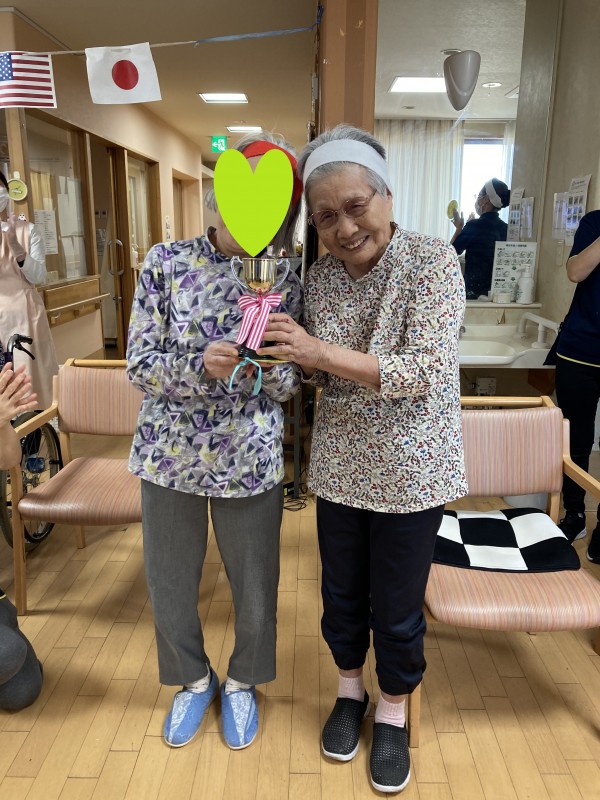 というわけで、トロフィーは丁度真ん中に座られていた、赤組白組両者のご利用者様お2人に代表で立って頂き、ホーム長からトロフィーが贈呈されました!!