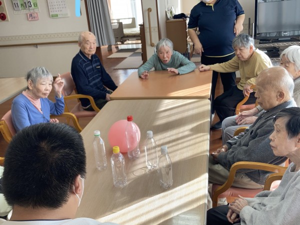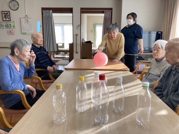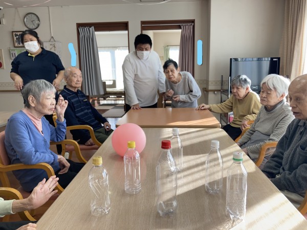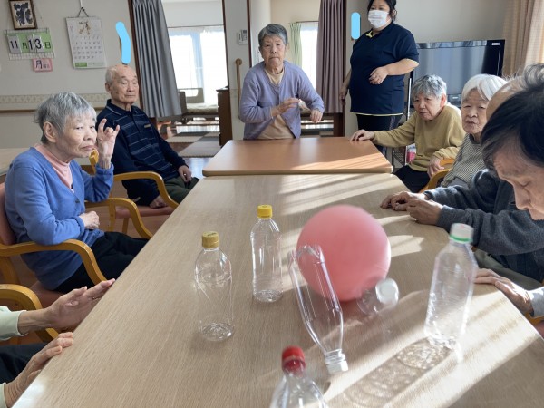 1階、2階の利用者様に声を掛けて2Fフロアへ集まっていただき、一緒にペットボトルボーリングをしました。