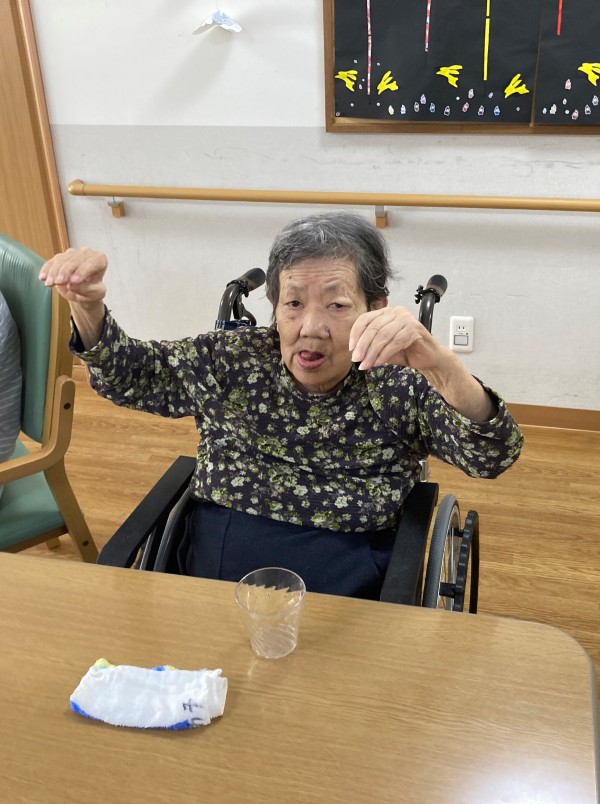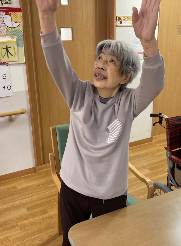 午前の体操の様子です。毎食前の口腔体操や月1回程のリモート体操以外にも、なるべく身体を動かして頂く為にTV番組を活用し体操をして頂いています。これも毎日の日課になっています。