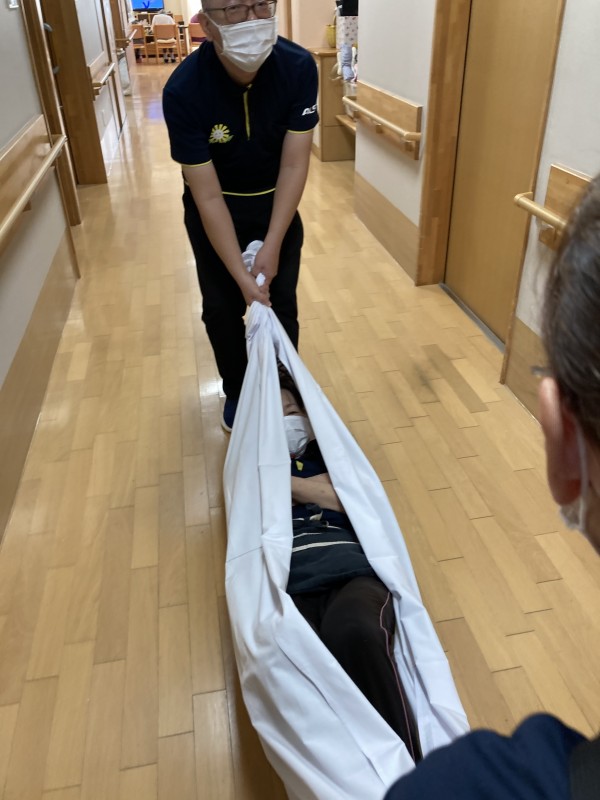 職員は引き続きシーツを使って怪我人を移動する訓練を行いました