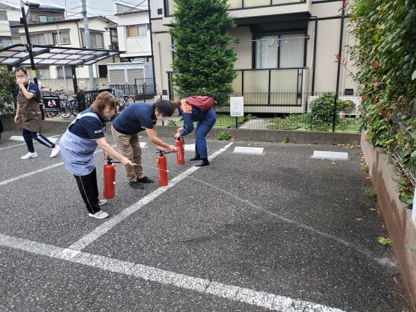 利用者様が各グループホームに戻られた後、水消火器訓練実施。