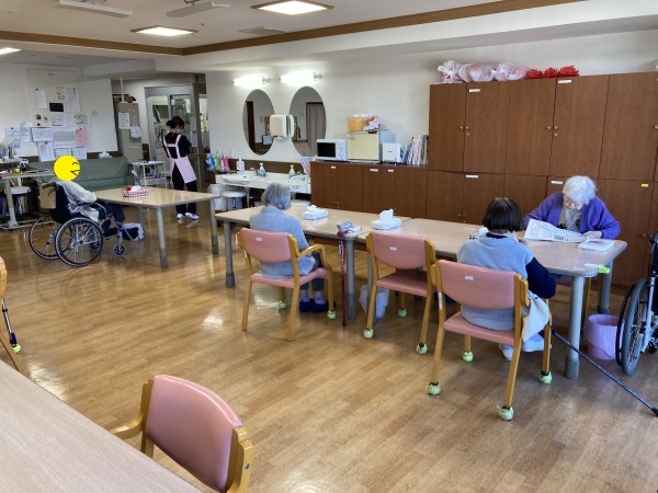 入居者のみなさまは変わらず元気に塗り絵や工作に取り組んでいただいたり、窓際でのんびり日向ぼっこされたりと、思い思いにお過ごしです。