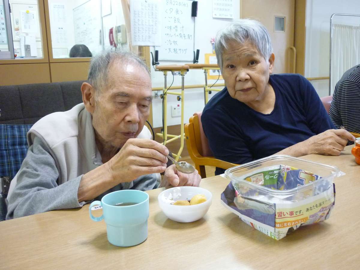 スタッフ手作りのコーヒーゼリー&ホイップクリーム付きシュークリームを召し上がり、2名の御利用者様が代表して歌のプレゼントをして下さいました。