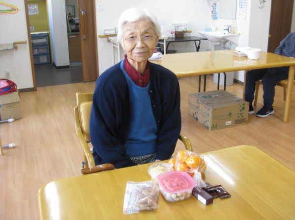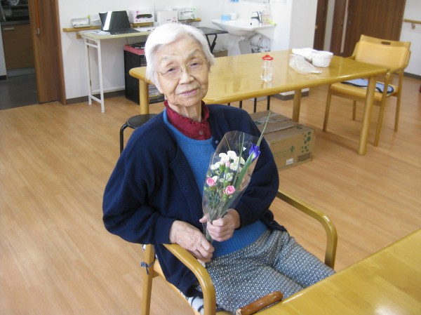 嬉しそうですね(^^♪ 綺麗なお花にお菓子をお持ち下さり「嬉しい!ありがとう!」と喜んでいました(*^_^*)
