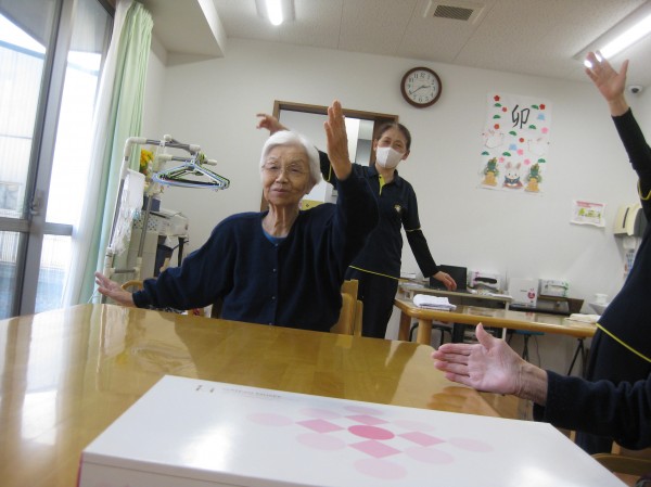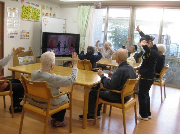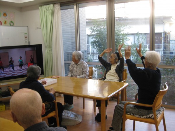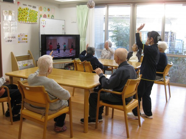 ビデオを見ながら体操をされています! 毎日行っているので慣れたものですね!(^^)! 楽しみながら行っています!!