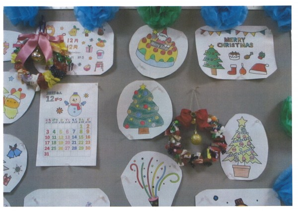本日は12月の装飾、壁面飾りをご紹介いたします。クリスマスは過ぎてしまいましたが、デイサービスはクリスマス仕様、1年でいちばん華やかな飾りですね。今年も残りわずか、なごりおしいクリスマス飾りです。皆様に塗っていただいた塗り絵や手作りのリース、とてもすてきです♪
