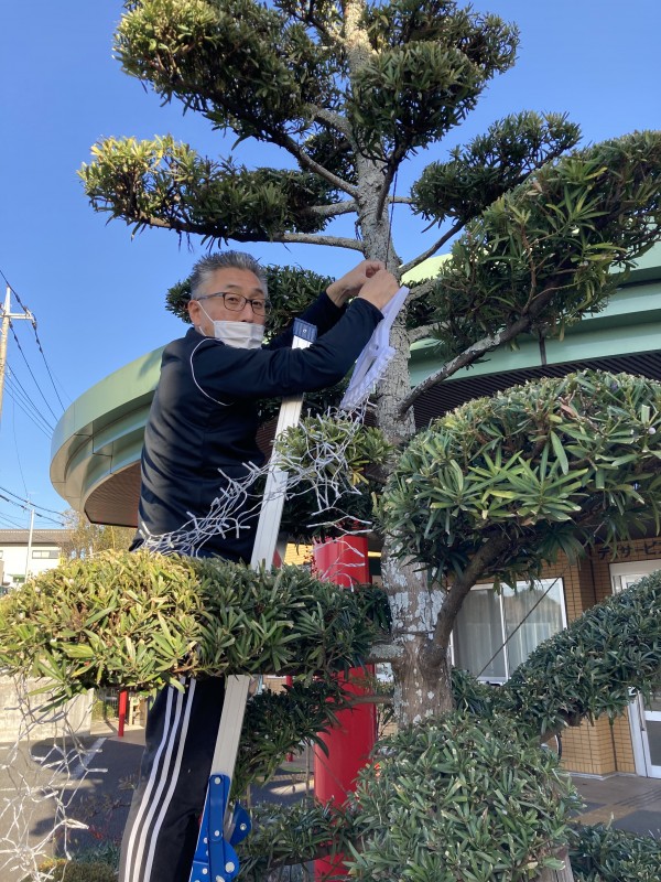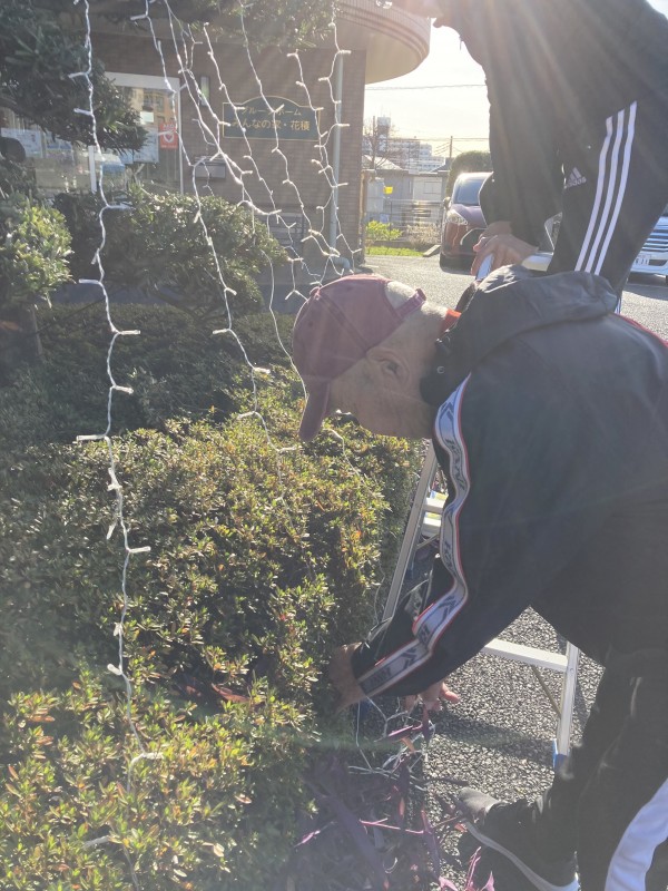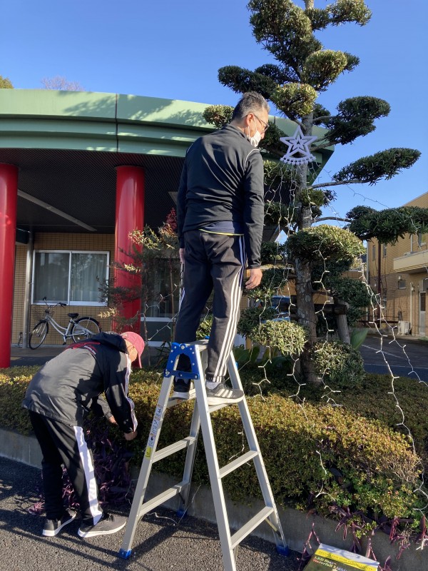 利用者様と一緒に中庭の大きな木にイルミネーション飾りを付けました。