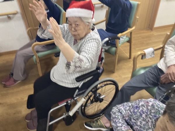 希望される方はサンタクロースの恰好等をされ、テレビの画面に合わせ、まずはジングルベルなどのクリスマスソングを歌いました。