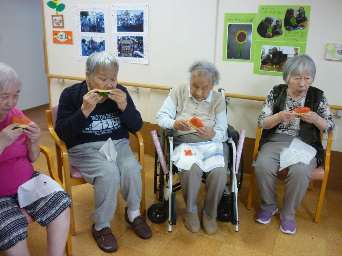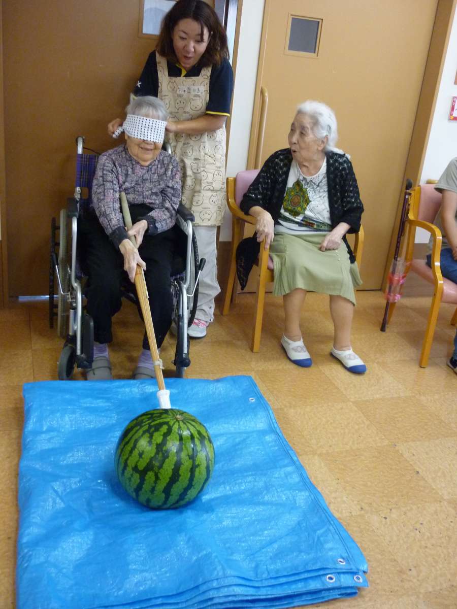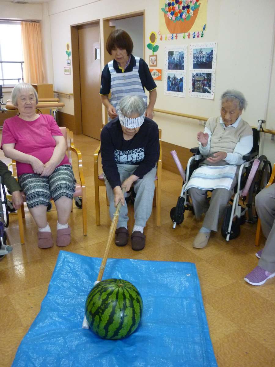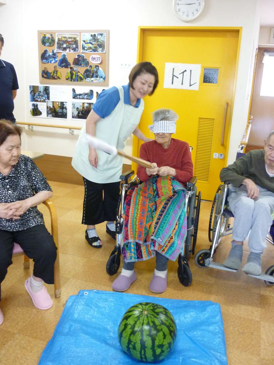 午後のおやつタイムに、水分補給を兼ねて、スイカ割りを開催しました。